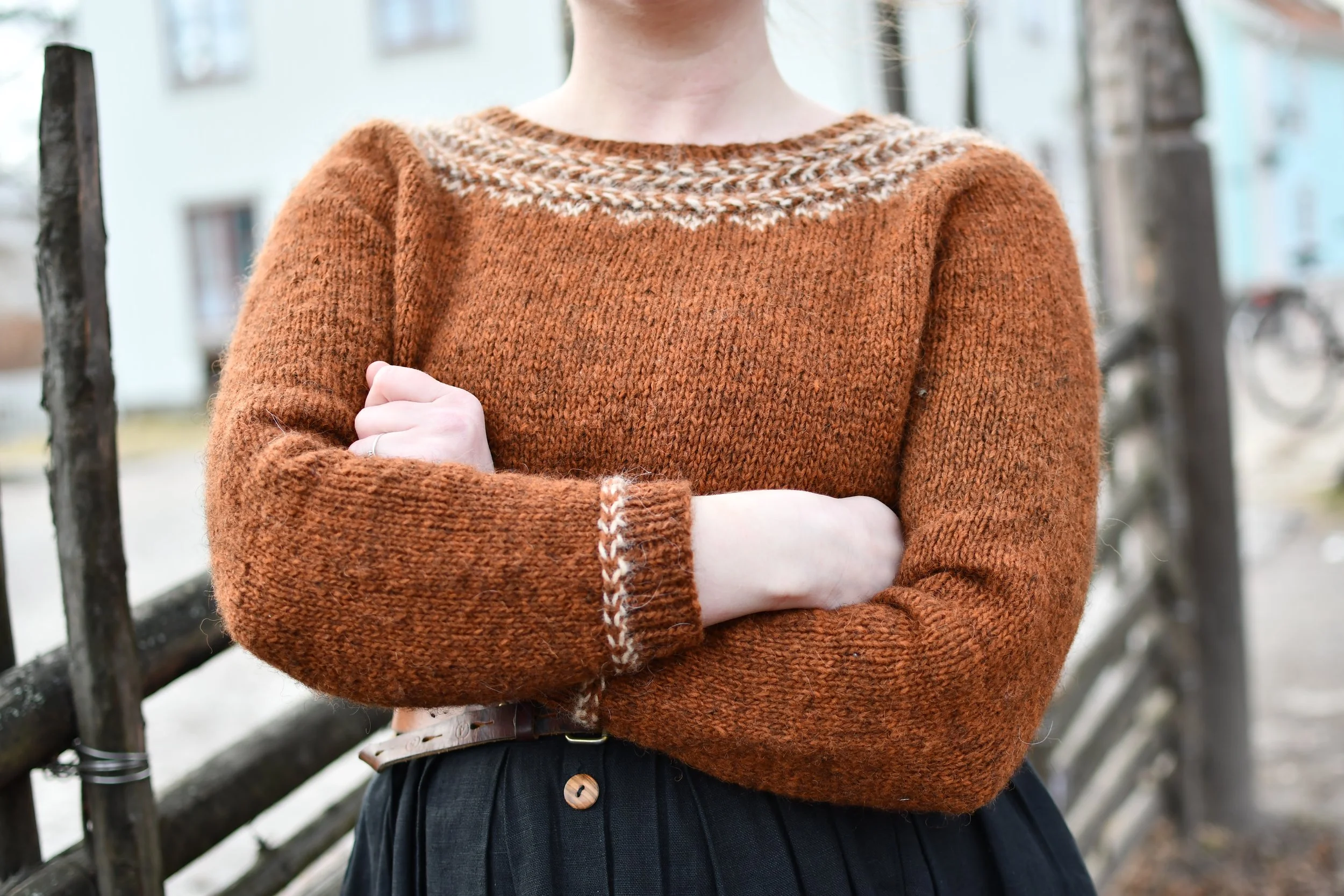 The yarn used in this pattern is Lettlopi in colors Rust heather (9427) and Barley (1419). I hadn’t knitted a sweater in the rust colored lettlopi before this one and as that is my favorite yarn and color - designing in it was a given. And I’m so happy with this sweater. It’s just perfect for everyday wear but is a bit fancy as well.